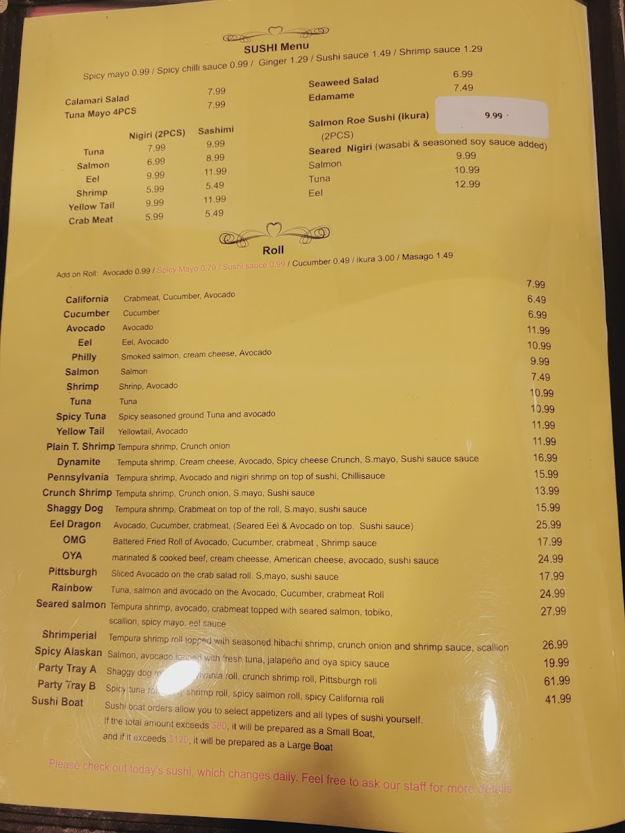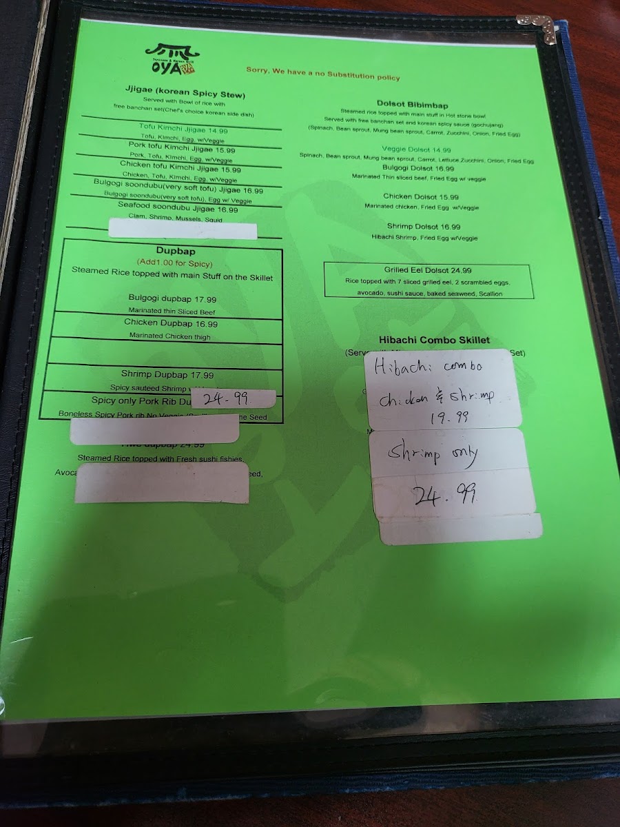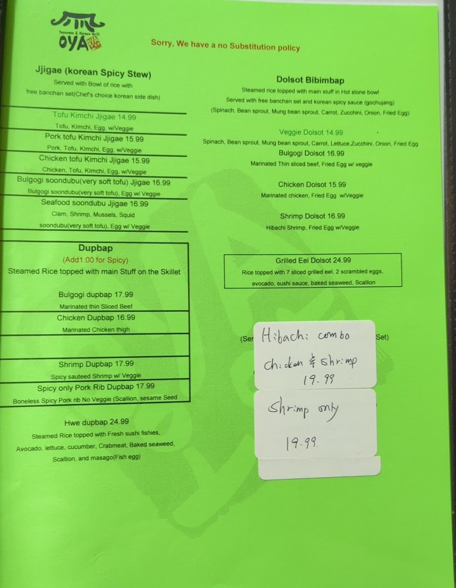 Oya Sushi and Korean Grill Menu